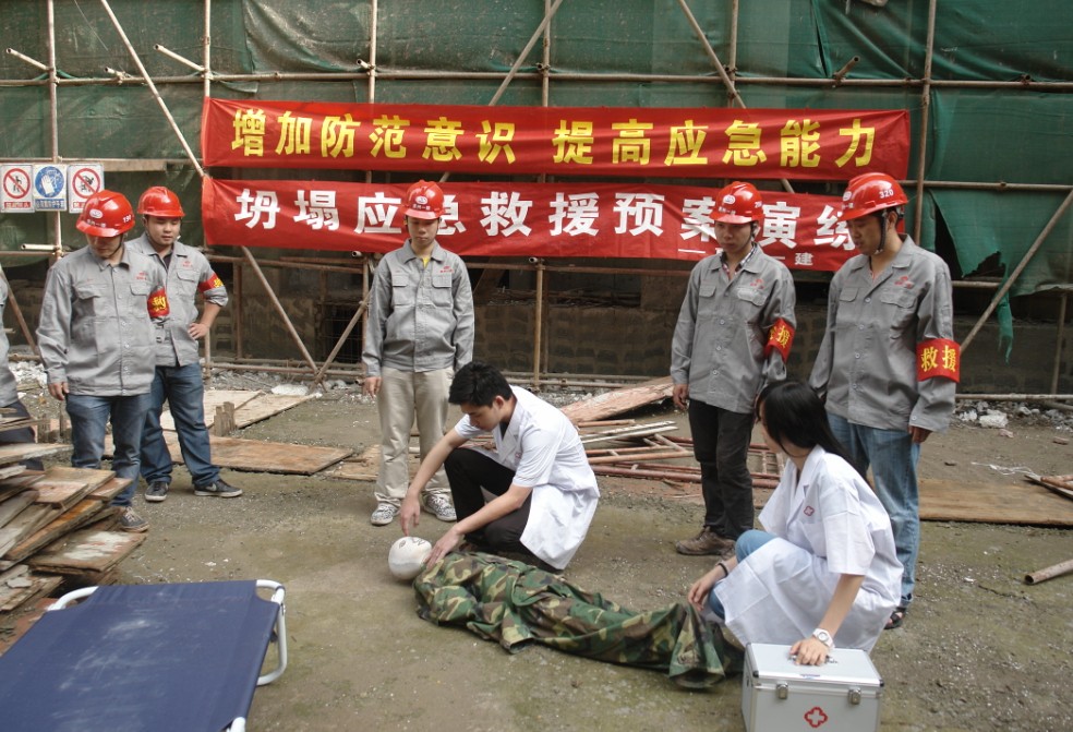 現(xiàn)場(chǎng)安全員發(fā)現(xiàn)有坍塌事故,120醫(yī)務(wù)人員及項(xiàng)目部救援小組趕到現(xiàn)場(chǎng)對(duì)工人進(jìn)行救治?